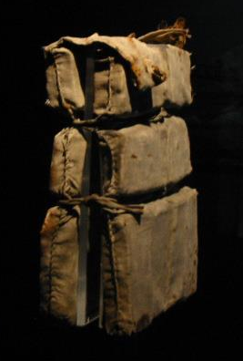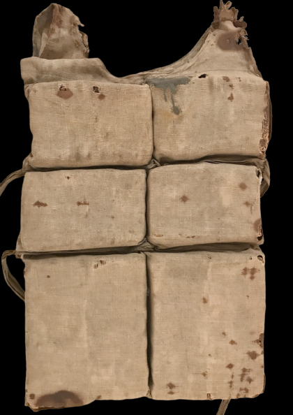 Sometimes the stains on this lifebelt are described as oil or rust stains, but it is also likely they could be blood stains as some of Titanic’s victims were found with broken jaws and necks. The reason for this is that when a passenger jumped from the sinking ship into the water, the buoyancy of the cork-filled lifebelts made them float immediately, while the wearer slipped down into the lifebelt due to there being no strap between the legs, causing the chin to be hit by the hard cork underneath being quickly thrust upward and the head to be knocked backward, hence breaking the wearer's jaw or even their neck. This design of lifebelt eventually became known as “jawbreakers” and was discontinued shortly afterward.